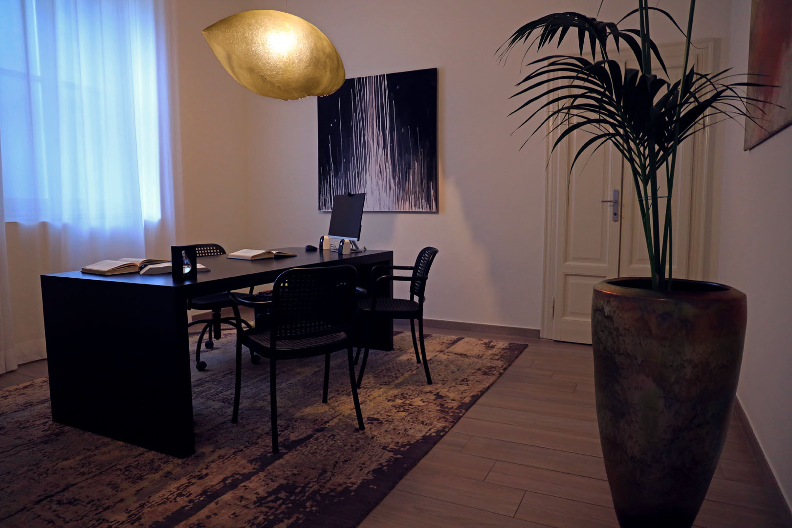 I tessuti a schermare le vetrate e gli elementi illuminanti, veri e propri oggetti decorativi, conferiscono all’ambiente quel “sapore di casa” che il committente pone come base di partenza per accogliere il cliente nel suo spazio lavorativo.